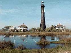 Bolivar Lighthouse History[Excerpt from "Bolivar!" by A Pat Daniels] The Lighthouse was built in 1872 and towers 117 ft. above sea level. It guided mariners for 61 years and was retired in 1933 when it was replaced by the South Jetty light. It is now privately owned and not open to visitors. A lighthouse which may have been erected by the Republic of Texas was dismantled during the Civil War and plans for the present Bolivar light made after that time. The Bolivar lighthouse is of brick sheathed in cast iron plates riveted together. It once glistened with a white-and-black banded exterior, but now is covered with rust and is almost a uniform black. The 52,000 candle-power beacon guided ships through the channel, which in earlier years was undredged, safely from the Gulf of Mexico into the Port of Galveston. The picture on the right is Bolivar Lighthouse in 2001 - Jack Owen Photo![]() The burner of the lamp was fed by kerosene, contained in storage tanks on the lower level, and the kerosene was forced through nozzles into a mantle where it became gas, burning with great intensity. Eight rays of light were produced every 15 seconds as the lamp slowly revolved throughout the night. Inside the lighthouse the brass finishings always were kept brilliantly polished, and it was considered one of the most attractive and efficient lighthouses on the Texas Gulf Coast. From Mrs H. C. Claiborne, wife of the first lighthouse keeper: "Life at the lighthouse is very lonely and friendless. There is very little visiting because travel is non-existent from the point to Galveston. We pass most of our time by reading books." The lighthouse withstood the onslaught of two of the worst storms recorded on the Texas Gulf Coast, the 1900 and the 1915 hurricanes. An inspector's report said after the 1900 storm - which claimed an estimated 6000 lives on Galveston Island - that, "through the keeper's efforts, the lives of 125 people were saved, and to my personal knowledge, he harbored and fed a large number of them for a considerable period". At one point during the storm, according to the story of one historian, the hurricane winds caused the tower to sway so badly that the machinery for the light failed to work, and that night Claiborne rotated the machinery by hand to keep the beacon bright. Winds of 126 miles per hour were recorded in the 1915 hurricane, and still the lighthouse withstood the pounding of wind and wave. The light in the tower burned every night during the years of it's service except two nights of that storm, Aug 17 and 18, when the supply of oil used to light the lamps floated away after the surging waters of an 11-foot tide burst open the door at the base of the tower. Sixty-one people took refuge in the lighthouse during that storm, huddling on the iron steps during the night as winds rocked the tower, and peering out the windows during the daylight to see their homes and crops being destroyed. Two houses, on stilts for protection from rising tides, were built near the lighthouse for the lighthouse keeper and his two assistants. H C Claiborne retired and was replaced by Capt J B Brooks in 1918. The government sold the lighthouse as surplus property in 1947.The E W Boyt interests entered a private bid of $5,500 which was $500 higher that the only other bid. On May 29,1933, after 61 years of service, the Bolivar lighthouse was officially retired. The inner mechanisms have been removed. The lamps and reflector lenses have been reassembled in the Galveston County Museum. In 1952, the land and buldings were sold to Pat E. Boyt. in 1968, the movie "My Sweet Charlie". starring Patty Duke and Al Freeman, Jr., was filmed at the lighthouse. No longer painted and maintained, the lighthouse has rusted to a uniform shade of black. It stands, near Highway 87, a visual delight and a symbol of the romance and adventure of long-ago times at sea. |